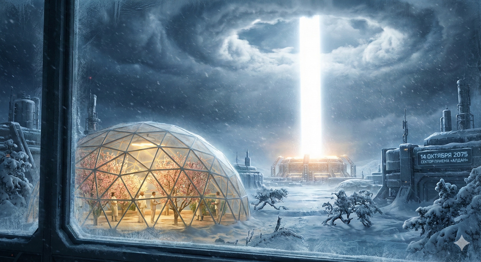 Look out the window, Boris. Beyond the dome’s glass—minus forty degrees, a blizzard burying the old cedars. But here, inside, peach trees bloom. Look higher. See that? Through the leaden clouds pierces a perfectly straight, blindingly white column of light. It doesn’t tremble. It doesn’t fade. The clouds around it don’t simply part—they evaporate instantly, forming a perfect ring of clear sky a kilometer in diameter. We call it the “Eye of the Storm.”